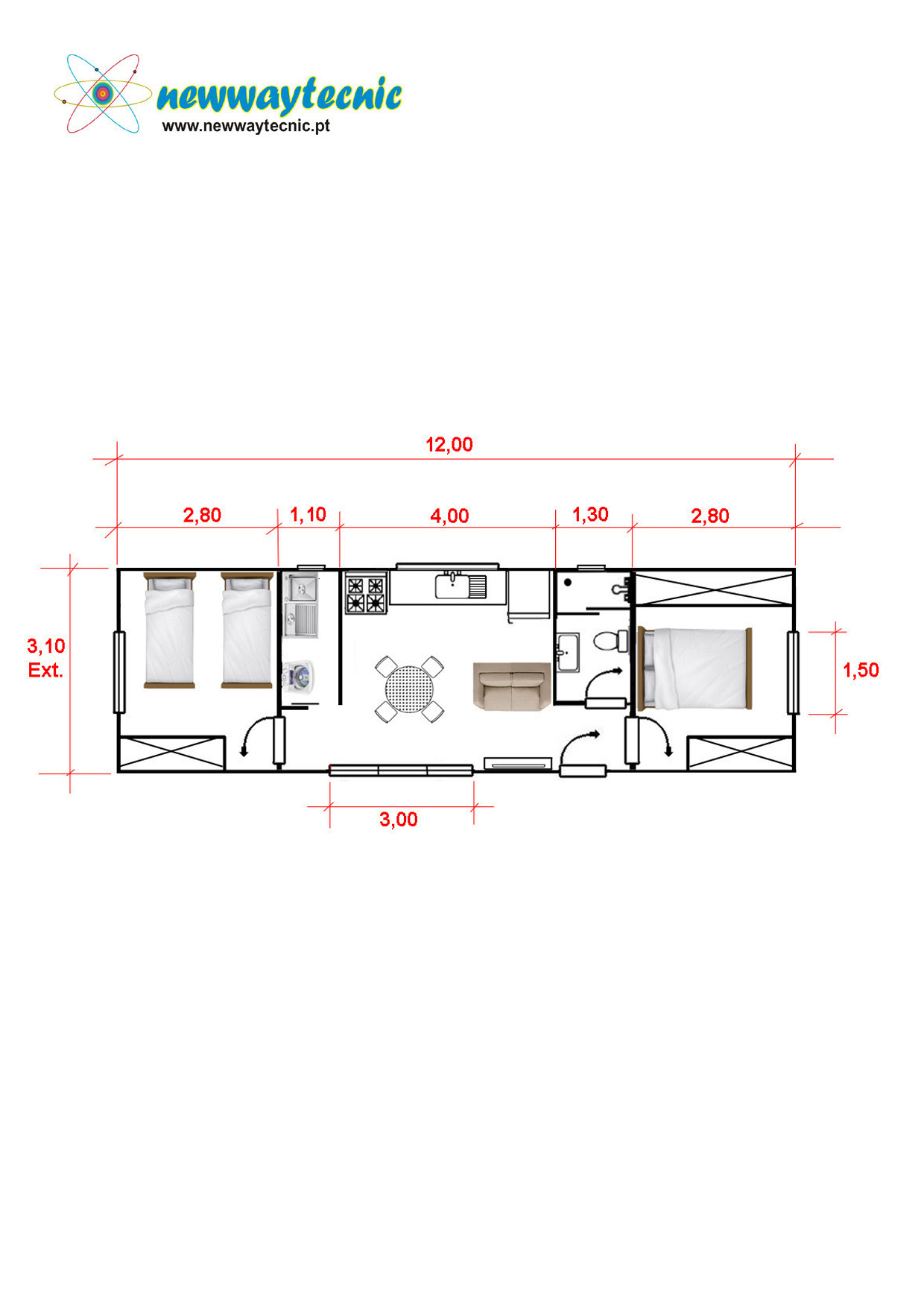 Casa Modular Amovível tipo contentor com 12mts comprimento e 3,10mts largura