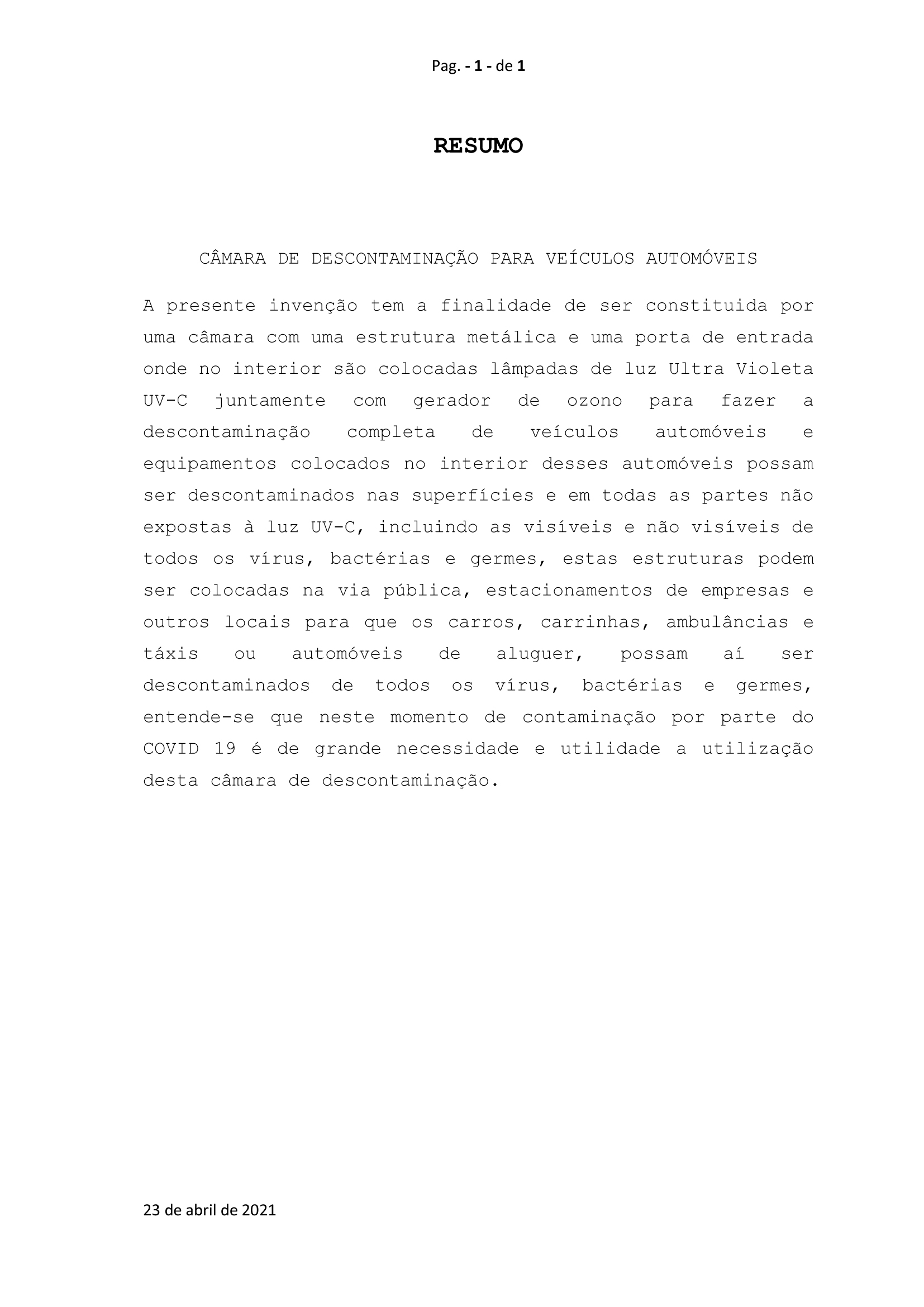 CÂMARA PARA DESCONTAMINAÇÃO COMPLETA DE VEÍCULOS AUTOMÓVEIS